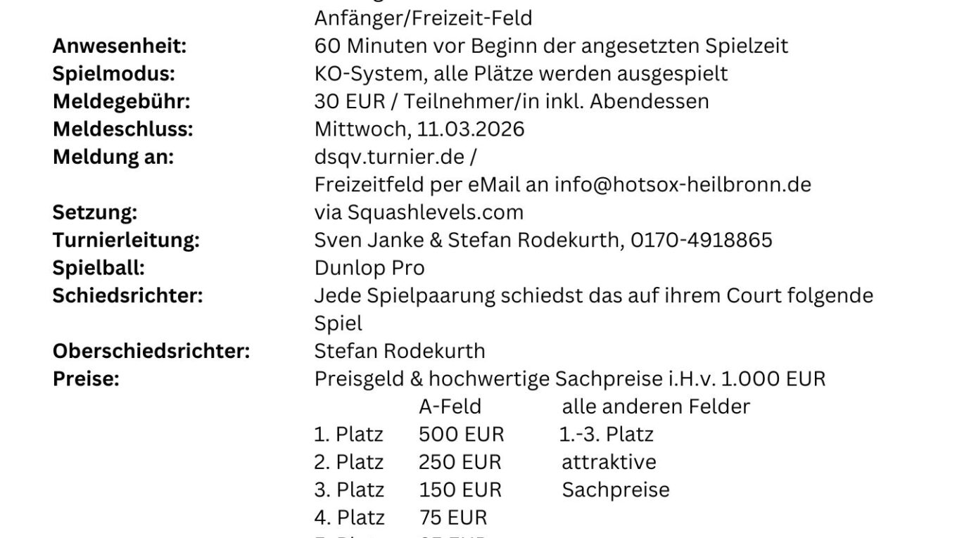 Die Heilbronn Squash Open finden auch im Jahr 2026 erneut statt. Zum 13. Mal laden die HOTSOX Heilbronn zu ihrem Haus-Turnier ein und begrüßen sowohl regionale Spieler:Innen aus Baden-Württemberg als